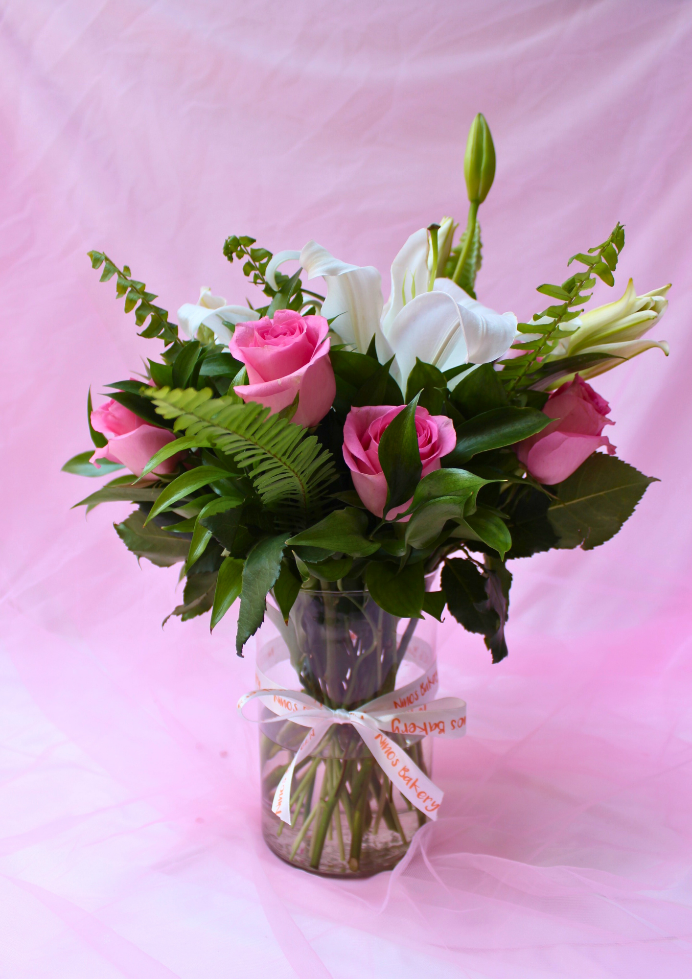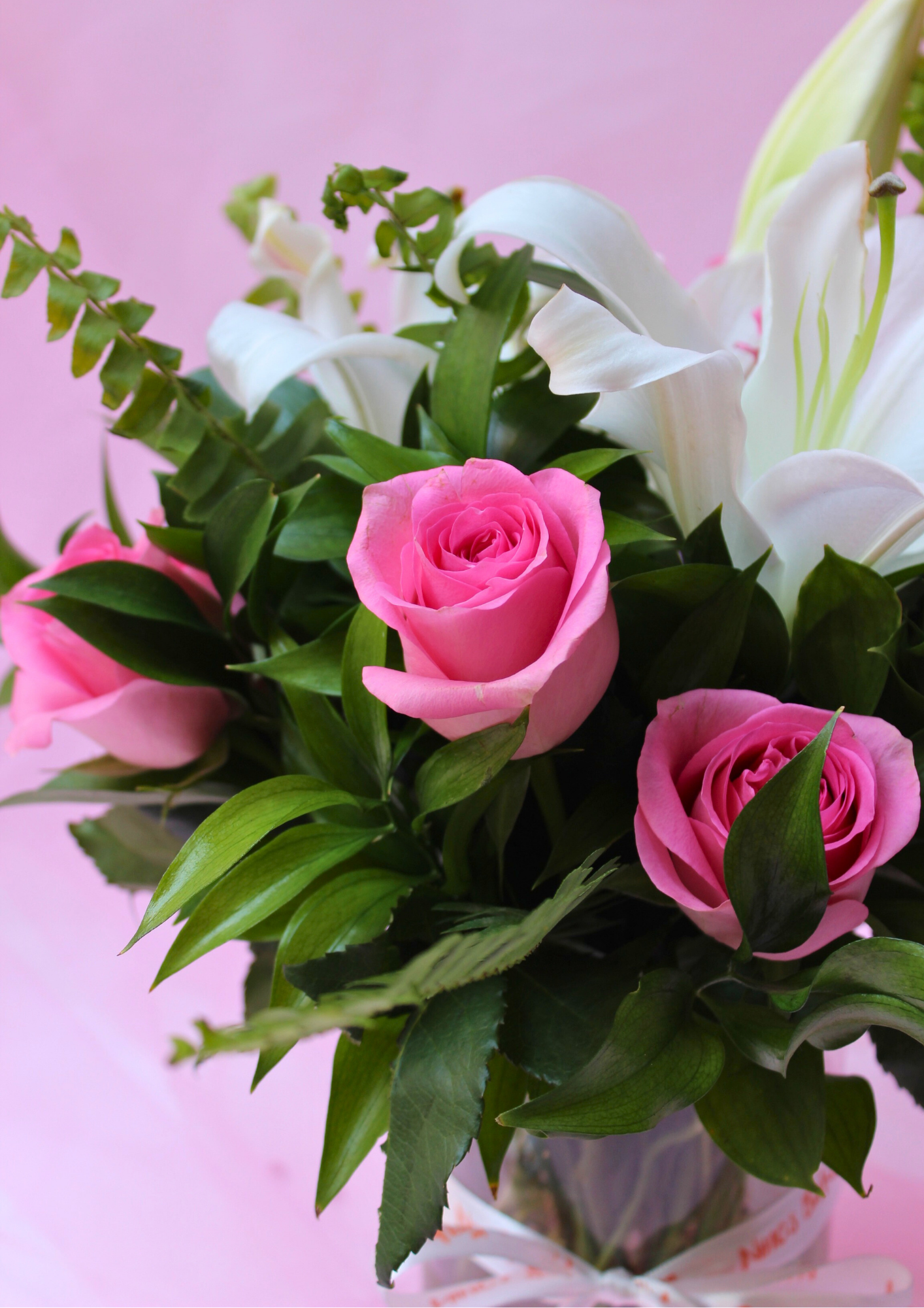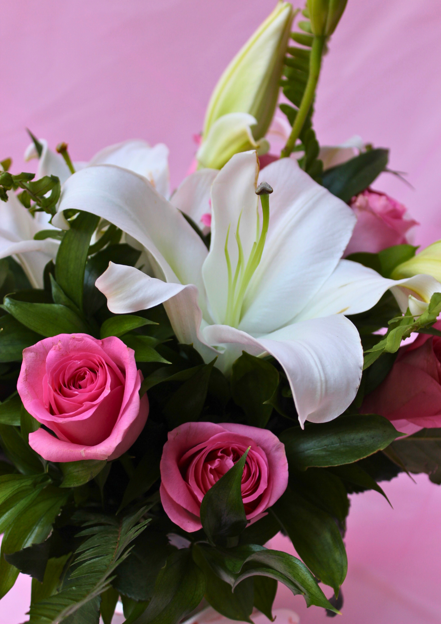 A breathtaking mix of delicate pink roses and lilies, creating a centerpiece that speaks volumes of love and admiration.