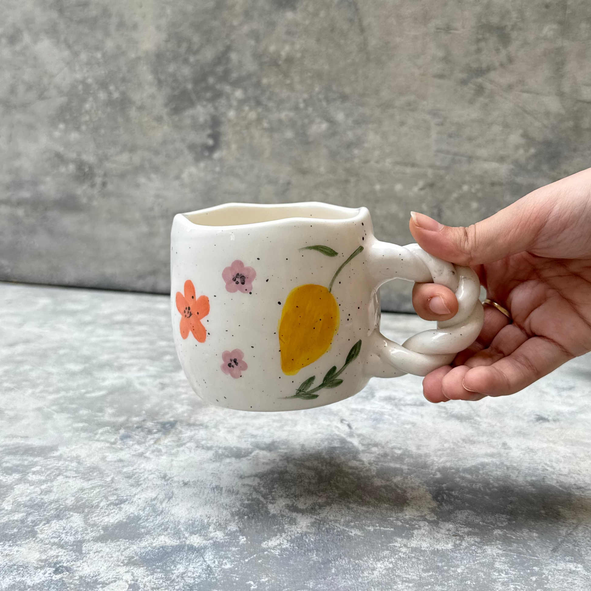 Lemon Zest Garden Mug is hand-painted with cheerful blooms, a dreamy speckled finish, and a twisted handle that adds the sweetest touch. Whether you're sipping matcha or gifting someone sunshine in a cup, this mug is made to romanticize the everyday.